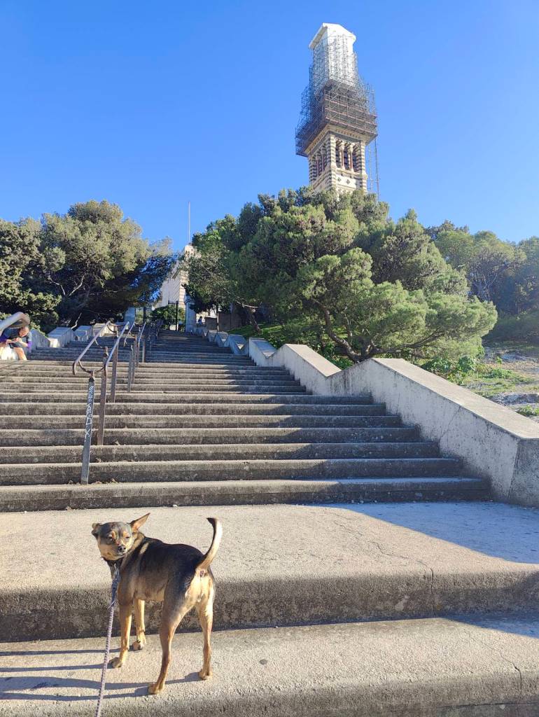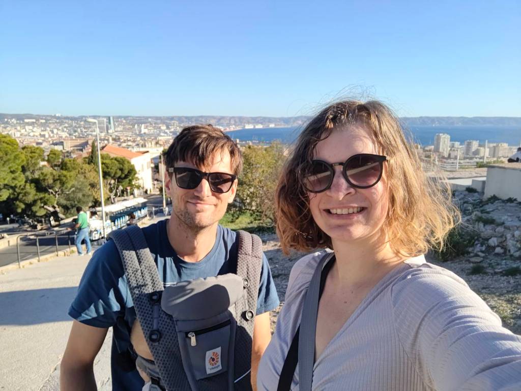 Die Stadt ist gewaltig und ganz anders als Nizza. Vorbei sind die ruhigen Fahrten über perfekte, saubere Straßen und mit gelassenen, respektvollen Verkehrsteilnehmer*innen. Am Weg und in Marseille geht es wieder richtig rund – im wahrsten Sinne des Wortes. Die vielen Kreisverkehre und Tunnel machen die Fahrt zu einer Reise durch ein Labyrinth. Dabei kommen wir am eleganten, fast protzigen Hafen vorbei, finden in einem Restaurant ein und steigen dann die Stiegen zum Notre Dame de la Garde empor. Lars haben wir diesmal in die Trage gepackt, was sich auch hinsichtlich der schmalen, unebenen Gehsteige als gute Entscheidung entpuppt hat.