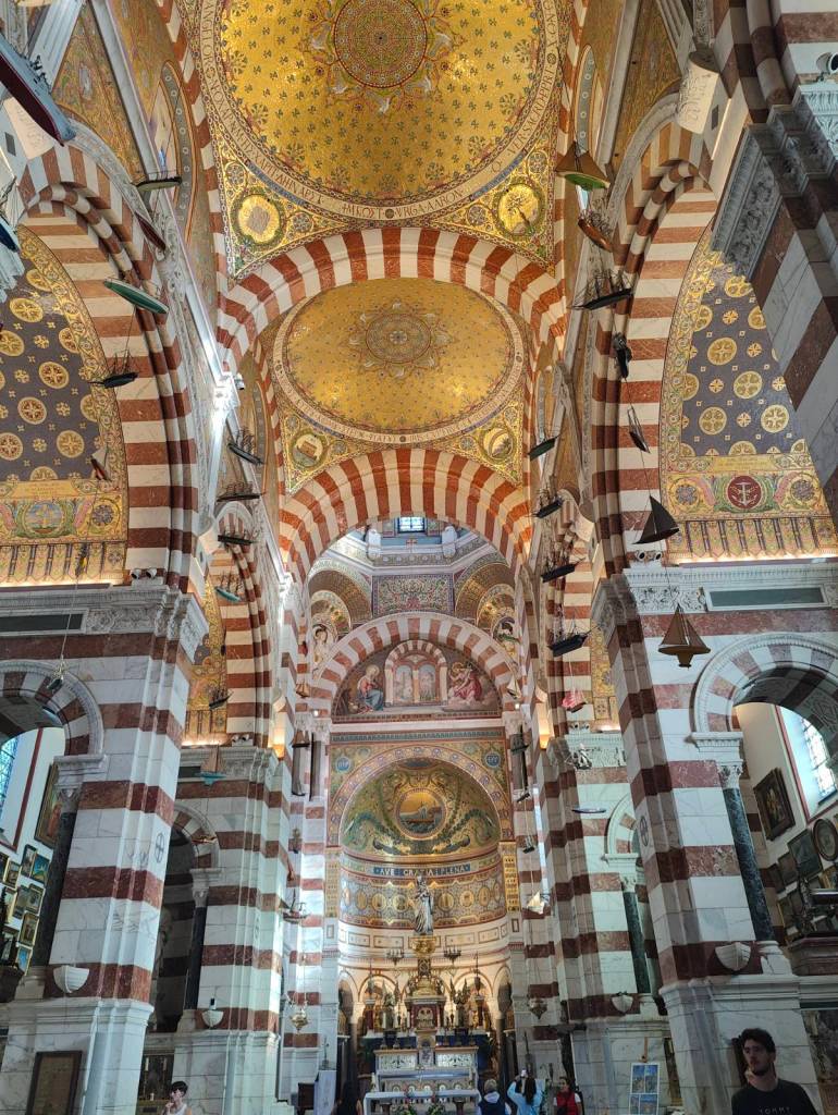 Die Basilika ist beeindruckend. Leider ist um die Turmspitze ein großes Gerüst gespannt, sodass es von außen gar nicht so prächtig wirkt, wie wir es dann Innen vorfinden: Nach der bescheidenen Krypt, in dem ein Bereich ausschließlich für Betende vorbehalten ist, strahlt die Basilika selbst in kräftigen Gold- und Rottönen. Die Wände sind mit prunkvollen Malereien verziert. Man muss den Hals in alle Richtungen verrenken, um all die Kunst sehen zu können. Über dem Altar steht eine Marienstatue, mit dem Jesus-Kind am Arm. Diese hat man auch in der Krypt gesehen, dort wurde sie jedoch so beleuchtet, dass links und rechts die Schatten der Statue an die kahlen Wänden geworfen wurde, was mir besonders gut gefallen hat. In der Basilika sieht man keine Schatten, alles in von hohen Fenstern perfekt ausgeleuchtet. Mein Lieblingspart an der Basilika sind die kleinen Schiff-Girlanden, die von der Decke des Kirchen-Schiffes hängen und an die Nähe zur Küste erinnern. Am Weg nach oben sieht man diese immer wieder. Mit dem Turm im Rücken hat man einen wunderschönen Blick aufs Meer, oder, wenn man den Turm einmal umrundet, auf die Stadt.