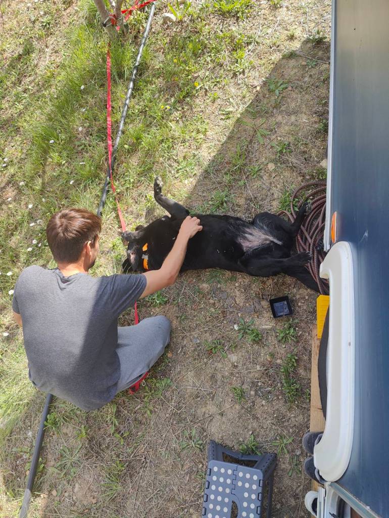 Dazu verlassen wir die Berge und fahren weiter an der Küste entlang. In der Nähe von Toulon und ca. 30 Auto-Min. von Marseille entfernt finden wir unseren nächsten Halt – beim Olivenbauer Vincent und seinem Vater Gerhard, der doch tatsächlich mit einer Bregenzerin verheiratet ist. Vincent und seine Frau Pauline haben noch einen 3-jährigen Sohn, Paul, der bei unserer Ankunft lauter Gänseblümchen pflückt und mir schüchtern reicht, während Gerhard unseren Anhänger mit seinem Traktor auf den Weg zwischen den Olivenbäumen zieht. Wir werden auch von Bella und Okra, den beiden großen Hofhündinnen, begrüßt. Beide sind über 10 Jahre alt, riesig, und verspielt wie kleine Welpen. Besonders Okra kommt uns während unseres Aufenthaltes regelmäßig besuchen. Ein riesiger, schwarzer Hund, mit einem Fußball im Maul, der sich vor unseren Füßen auf den Rücken wirft und gekrault werden will.