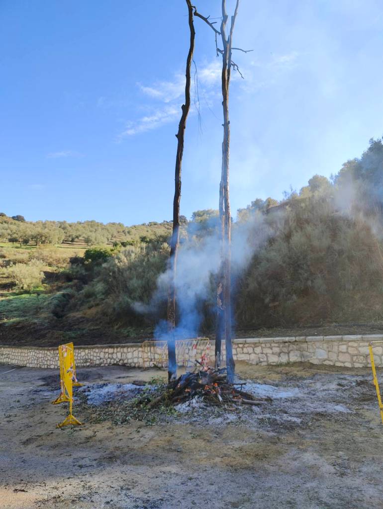 Ja, und dann ist es Zeit, wieder Richtung Norden zu fahren. Nach über 3 Monaten Fahrt in den Süden treten wir also den Rückweg an. Wir verbringen wieder einen Zwischenstop bei Andres. Dieser zeigt uns einen riesigen Turm aus trockenen Olivenzweigen, der vor der Ortschaft aufgebahrt wurde, und erklärt uns, dass traditionell am Abend vor dem Festivo de la Reya (Maria Empfängnis), ein großer Holzturm verbrannt wird. Hier ohne irgendwelchen Sicherheitsmaßnahmen. Wir verpassen das große Feuer, schauen aber am nächsten Tag am späten Vormittag vorbei, und tatsächlich brennt das Feuer da noch.